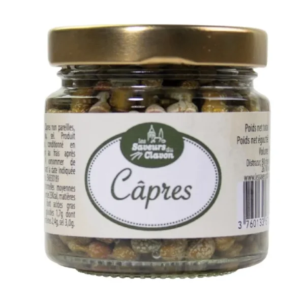Ingrédients : Câpres non pareilles, vinaigre, eau, sel. Produit d’importation, conditionné en France.Valeurs nutritionnelles pour 100 g :Énergie : 23 kcalMatières grasses : 0,9 gDont acides gras saturés : 0,2 gGlucides : 1,7 gDont sucres : 0,4 gProtéines : 2,4 gSel : 3,0 g Valeurs nutritionnelles moyennes pour 100g : Energie: 0 kcal/0 kJ Lipides: g dont acides gras saturés: g Glucides: g dont sucres: g Protéines: g Sel: g