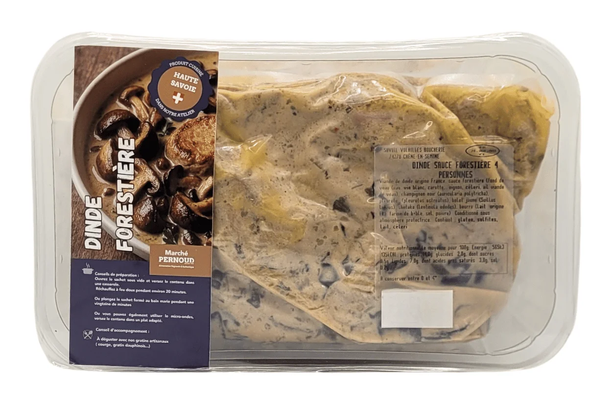 viande de dinde origine france, sauce forestière (fond de veau (eau, vin blanc, carotte, oignon, CÉLERI, ail, viande de veau), champignon noir (auricularia polytricha), pleurote (pleurotus ostreatus), bolet jaune (suillus luteus), shiitake (lentinula edodes), beurre (LAIT origine fr), farine de blé GLUTEN, sel, poivre).