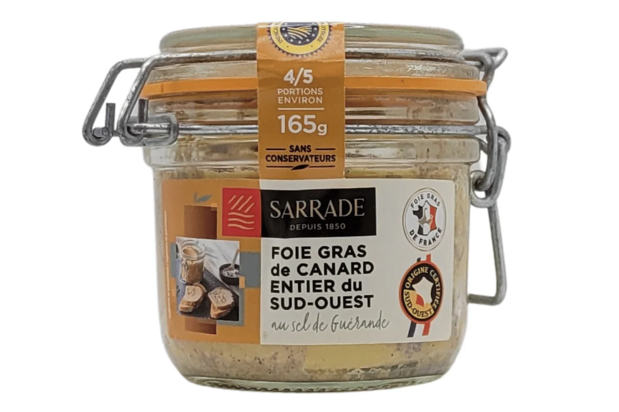 Ingrédients : foie gras de canard du Sud-Ouest (origine France), sel de Guérande 1,5 %, poivre, épices.