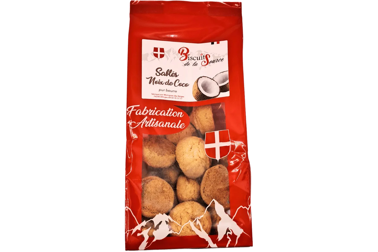 Farine de blé GLUTEN, beurre (LAIT), sucre, noix de coco râpée, œuf (ŒUFS), poudre à lever (E450, E500), amidon de froment GLUTEN.