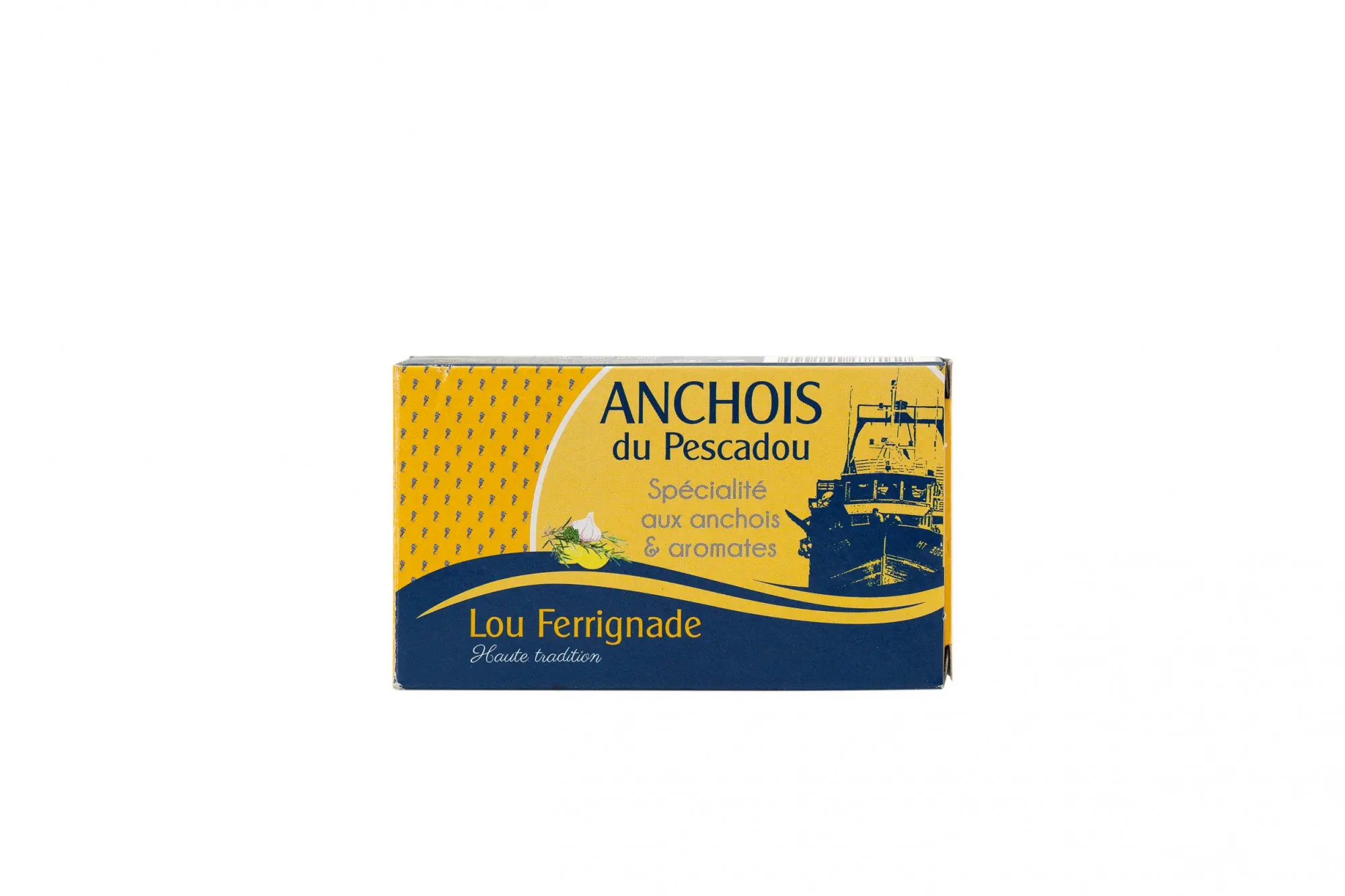 Ingrédients : Anchois (Engraulis encrasicolus) (POISSON), huile d’olive vierge extra, aromates (citron, ail, persil) 3%, sel. Valeurs nutritionnelles moyennes pour 100g : Energie: 182 kcal/761 kJ Lipides: 8.40 g dont acides gras saturés: 3.10 g Glucides: 0.50 g dont sucres: 0.50 g Protéines: 26.00 g Sel: 1.20 g