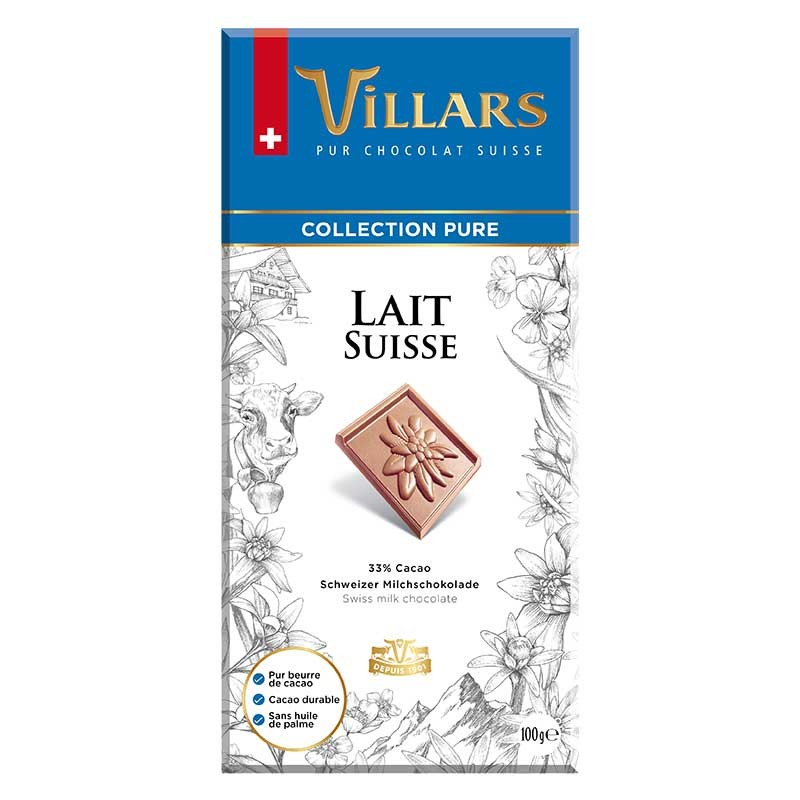 Ingrédients : sucre, beurre de cacao, lait entier en poudre, pâte de cacao, lait écrémé en poudre, beurre fondu (lait), petit-lait en poudre, extrait de malt en poudre (orge), émulsifiant (lécithine de colza), arôme naturel de vanille. Valeurs nutritionnelles moyennes pour 100g : Energie: 555 kcal/2315 kJ Lipides: 35.00 g dont acides gras saturés: 21.00 g Glucides: 52.00 g dont sucres: 51.00 g Protéines: 7.20 g Sel: 0.31 g
