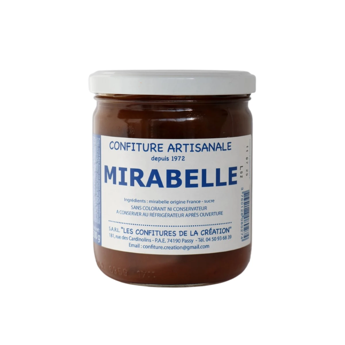 Ingrédients : Confiture de Mirabelle de Lorraine (préparée avec 59g de fruit pour 100g). Peut contenir des noyaux. Sans colorant ni conservateur. Valeurs nutritionnelles moyennes pour 100g : Energie: 253 kcal/1072 kJ Lipides: 0.30 g dont acides gras saturés: 0.10 g Glucides: 61.20 g dont sucres: 50.00 g Protéines: 0.10 g Sel: 0.10 g