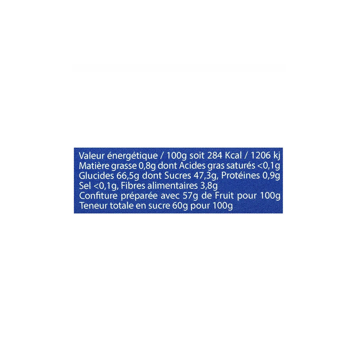 Ingrédients : Confiture de Mûre sauvage (préparée avec 57g de fruit pour 100g). Sans colorant ni conservateur. Valeurs nutritionnelles moyennes pour 100g : Energie: 284 kcal/1206 kJ Lipides: 0.80 g dont acides gras saturés: 0.10 g Glucides: 66.50 g dont sucres: 47.30 g Protéines: 0.90 g Sel: 0.10 g