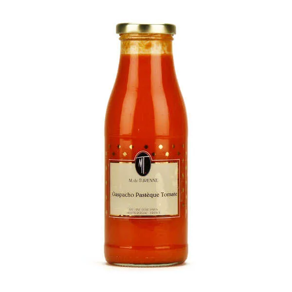 Ingrédients : Pastèque 56%, tomate 33%, oignon, poivron, huile d'olive, vinaigre de vin (sulfites), sel, amidon de maïs modifié. Valeurs nutritionnelles moyennes pour 100g : Energie: 40 kcal/167 kJ Lipides: 1.20 g dont acides gras saturés: 0.50 g Glucides: 6.30 g dont sucres: 5.40 g Protéines: 0.60 g Sel: 0.70 g
