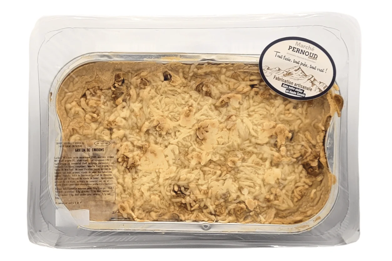 cardons 44 % (eau, acide ascorbique E300), marrons, crème UHT (LAIT origine fr, stabilisant : carraghénanes E407), LAIT origine fr, emmental (LAIT de vache pasteurisé, sel, ferments lactiques, coagulant), beurre (LAIT origine fr), farine de blé (GLUTEN), fond de veau (fécules, sucre, extrait de levure, sel iodé, arômes, viande de veau, maltodextrine, oignon, tomate, huile de tournesol, extrait de chicorée, colorant, jus de cuisson de viande de bœuf, épaississant, extrait de vin blanc, extraits de romarin), sel, ail, poivre.