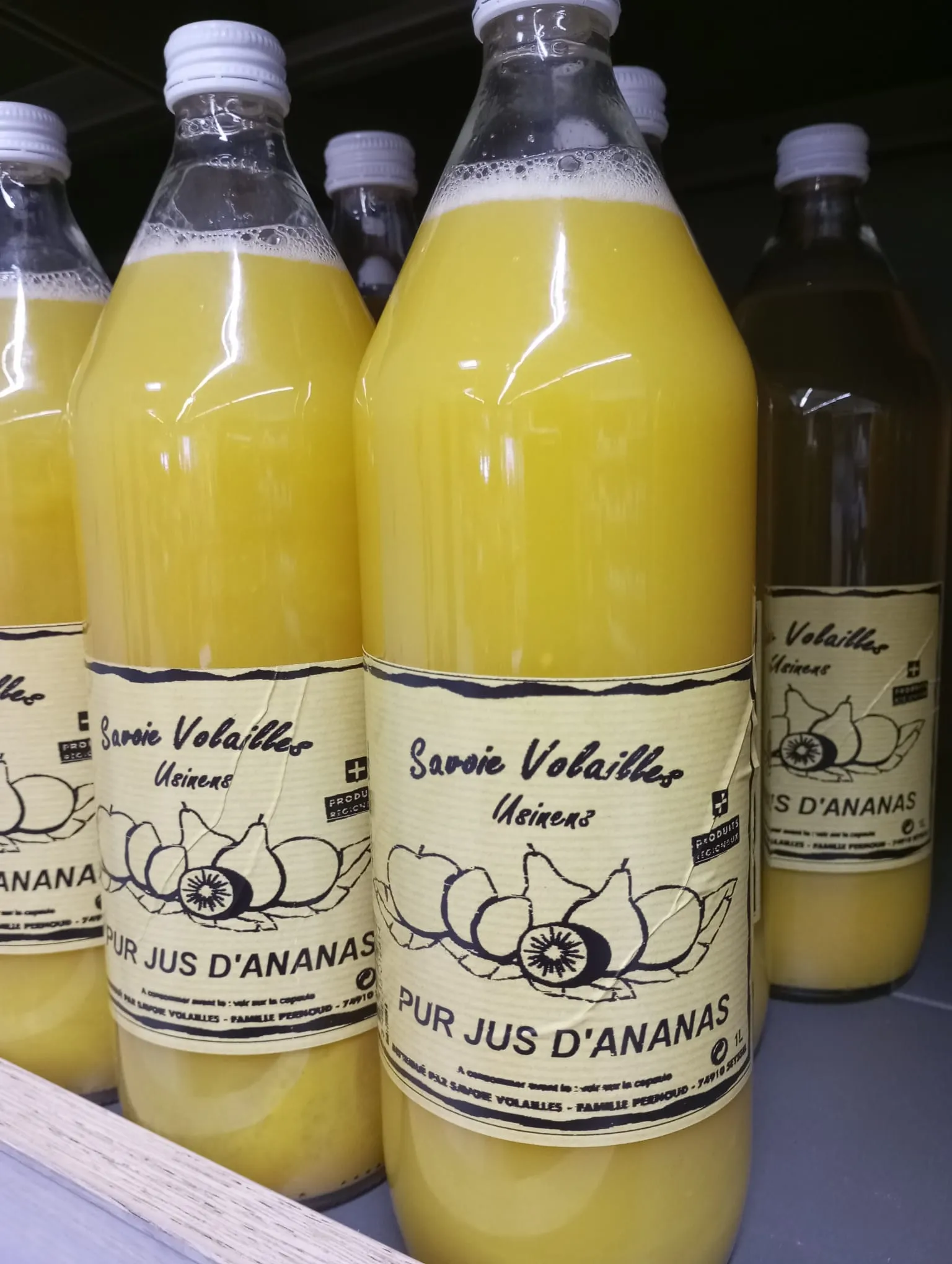 Ingrédient: pur jus d'ananas.Le pur jus ne contient ni conservateur ni sucre ajouté. Valeurs nutritionnelles moyennes pour 100g : Energie: 32 kcal/136 kJ Lipides: 0.10 g dont acides gras saturés: 0.10 g Glucides: 11.70 g dont sucres: 7.00 g Protéines: 0.30 g Sel: 0.00 g