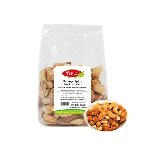 Découvrez le Mélange Apéro Saint Germain Meyva, un assortiment gourmand composé d’amandes, noix de cajou et arachi...