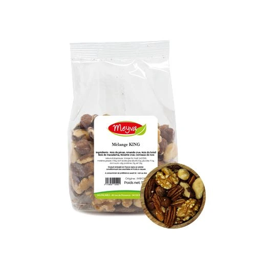 FRUITS À COQUES (noix de pécan, noix de macadamia, noix du Brésil, noisette crue, amande crue). Valeurs nutritionnelles moyennes pour 100g : Energie: 688 kcal/2844 kJ Lipides: 66.00 g dont acides gras saturés: 8.00 g Glucides: 9.00 g dont sucres: 4.00 g Protéines: 14.00 g Sel: 0.10 g