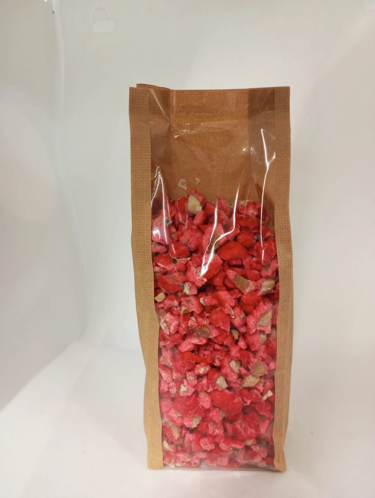 Ingrédients: sucre, sirop de glucose, amandes 12%, épaississant (gomme arabique), agents d'enrobage huile de colza, cire d'abeille, colorant E129 et arôme vanilline. Valeurs nutritionnelles moyennes pour 100g : Energie: 412 kcal/1741 kJ Lipides: 6.60 g dont acides gras saturés: 0.50 g Glucides: 84.00 g dont sucres: 77.00 g Protéines: 3.20 g Sel: g