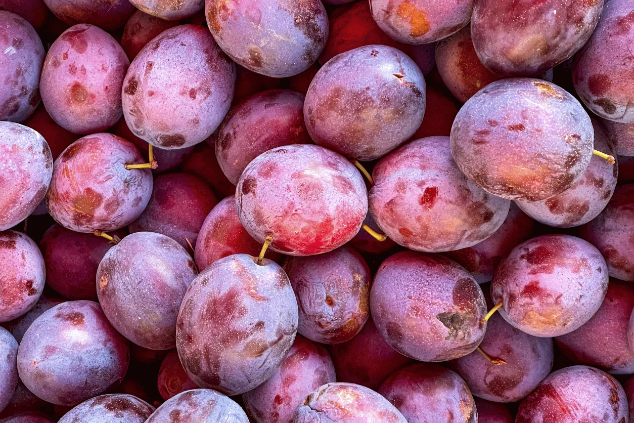 Le colis de 5kg de prunes Quetsche origine France offre des fruits charnus à la peau violette et à la chair jaune dorÃ...