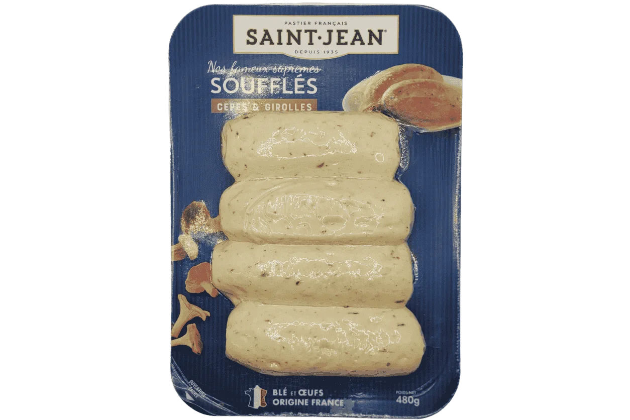 ŒUFS 30 %, eau, farine de blé GLUTEN 19 %, huile de colza, girolles 3 %, mélange de champignons forestiers 3 % (bolets jaunes et bais, cèpes 0,6 %), sel, protéines de LAIT, arôme naturel (blé GLUTEN).Peut contenir des traces de : POISSON et CRUSTACÉ.